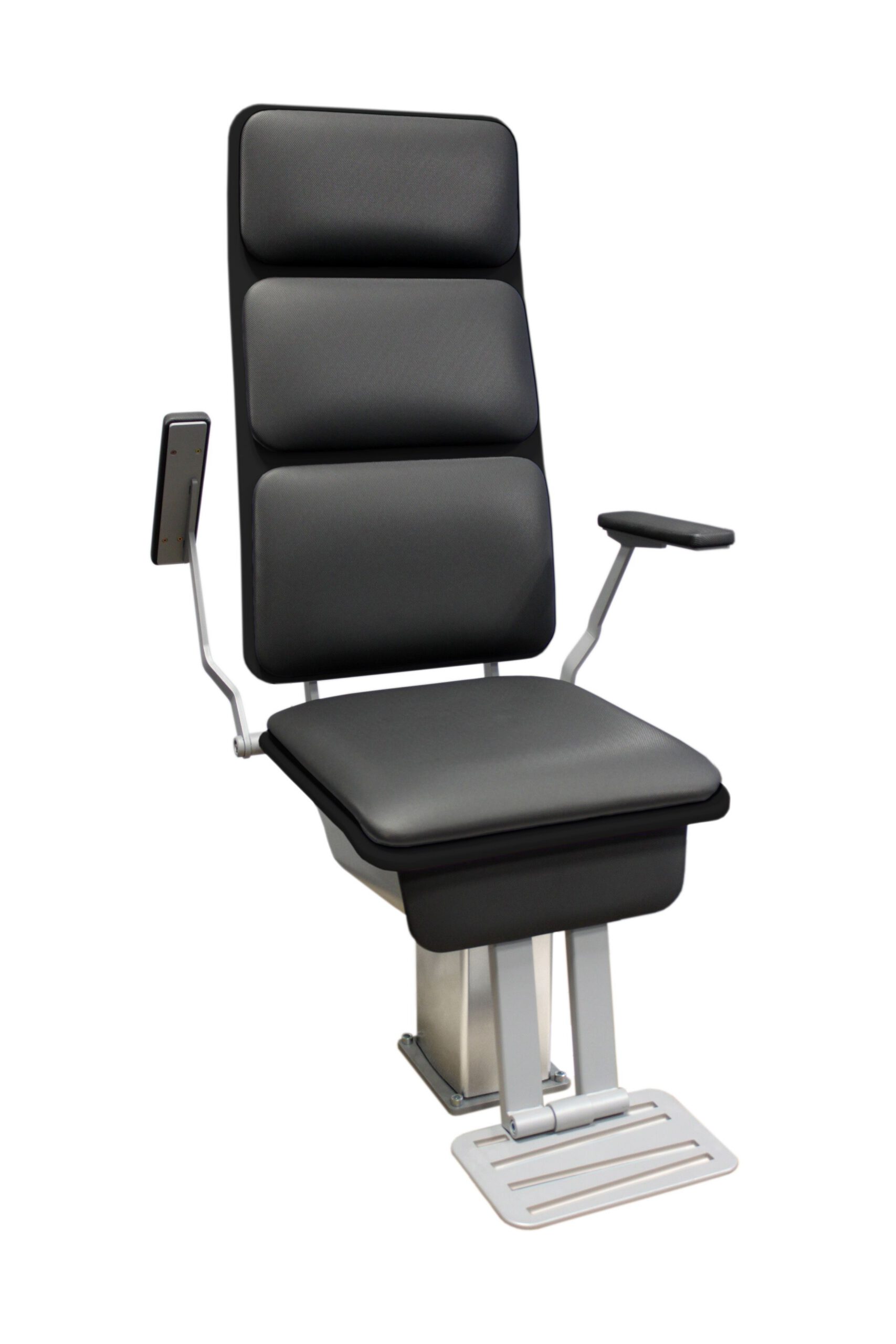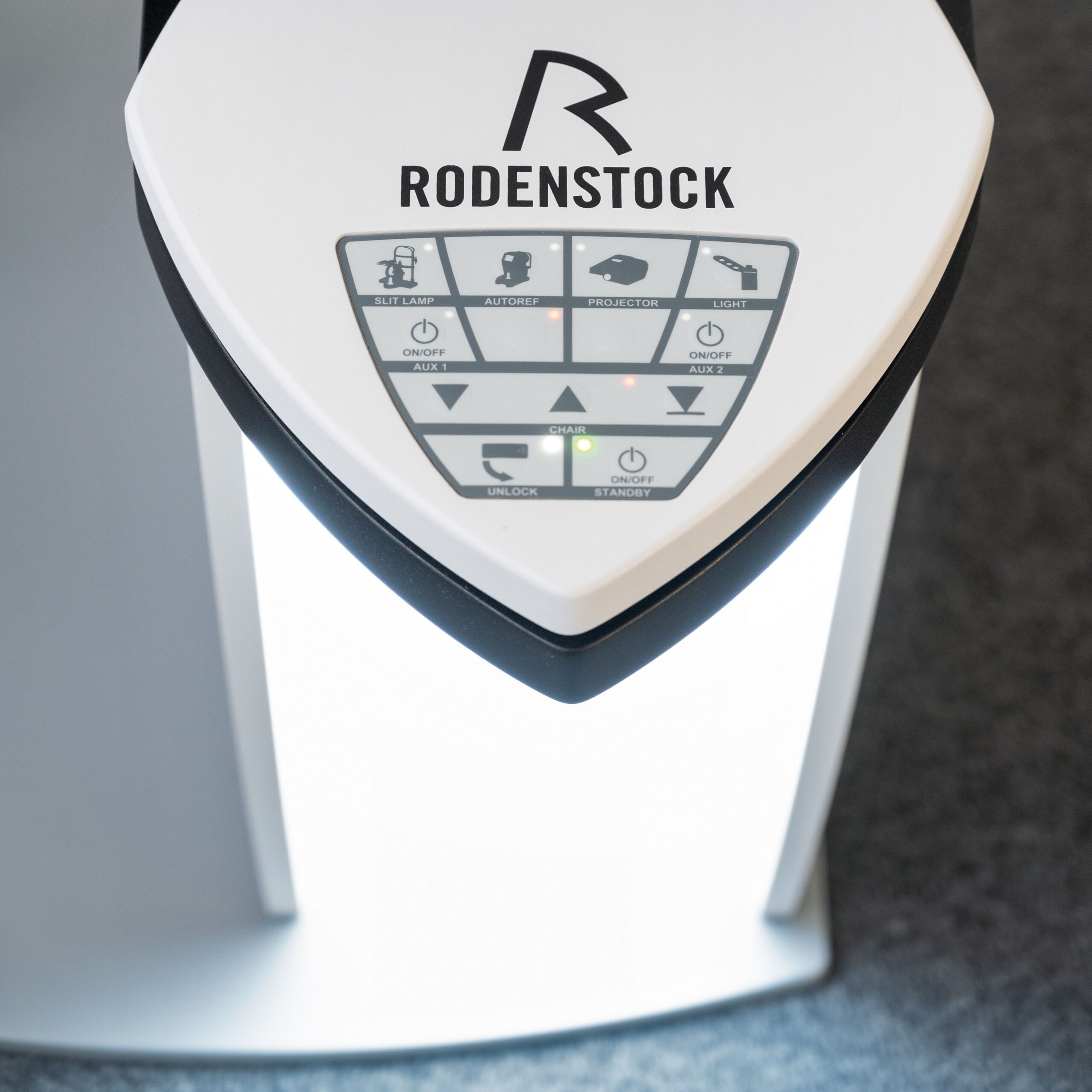 Rodenstock Refraktionseinheit Pro-500. Die automatische Höhenverstellung des Stuhles mit klappbarer Fußstütze und wegschwenkbaren Armlehnen bietet dem Patienten eine optimale Sitzmöglichkeit.